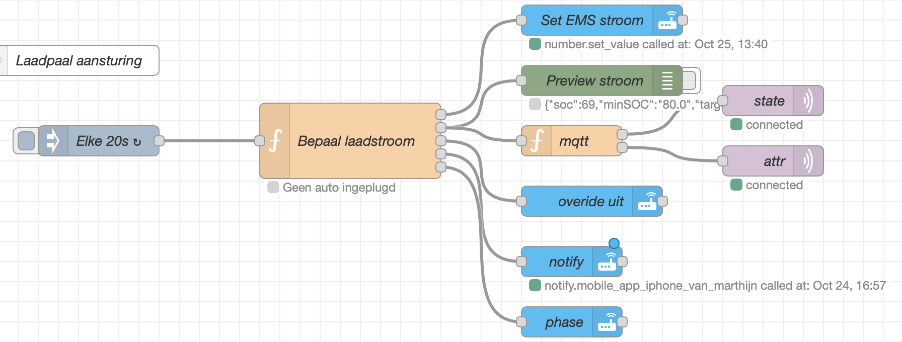 De flow draait elke 30 seconden en stuurt de laadstroom naar je laadpaal via Home Assistant. Zo laad je optimaal, bespaar je kosten en gebruik je je eigen zonne-energie efficiënter.